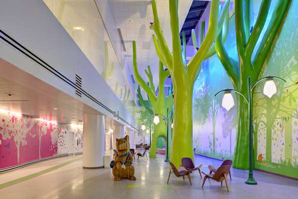 俄亥俄州Nationwide 儿童医院打破一般人对医院的想法,不再是冰冷的白色,干净亮堂的地面经过色彩的点缀,显得特别的舒心,巨大的整排落地窗,让阳光照射进来,仿佛可以让小朋友觉得温暖,丰富的色...